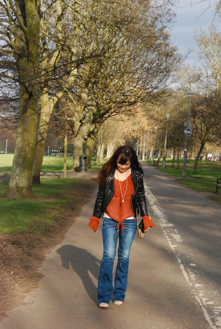 選擇一條刷色好看的靴型褲...上衣再搭配今年流行的橘色大色塊的上衣...